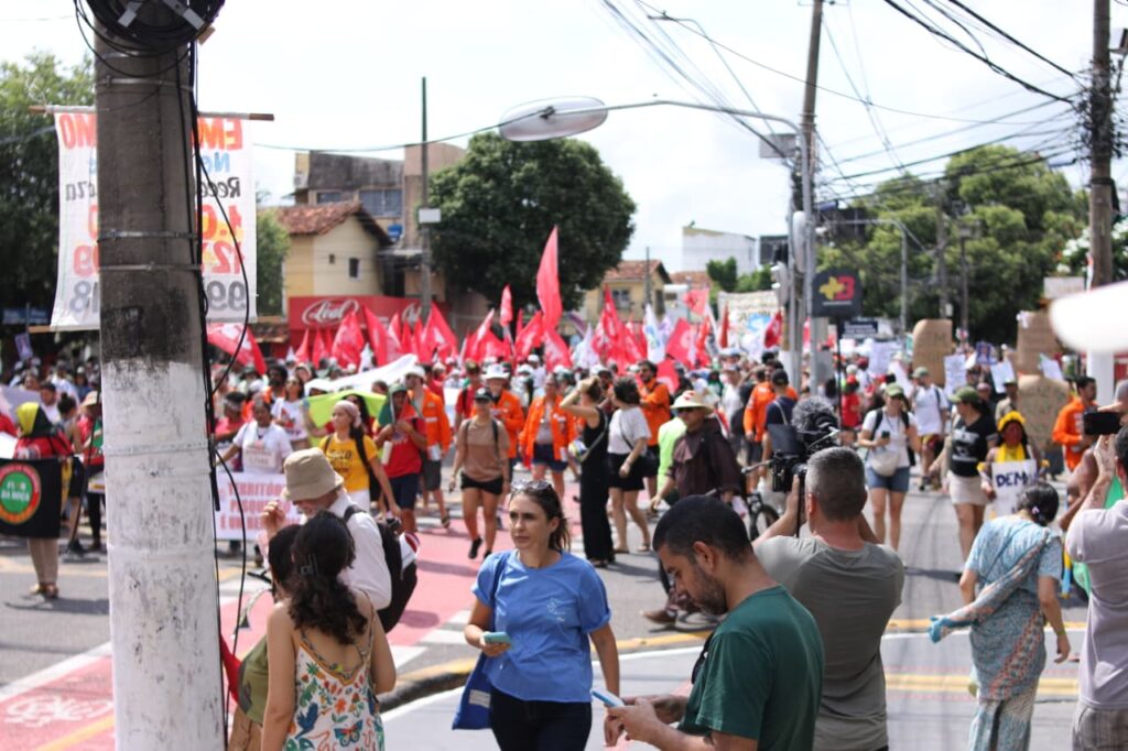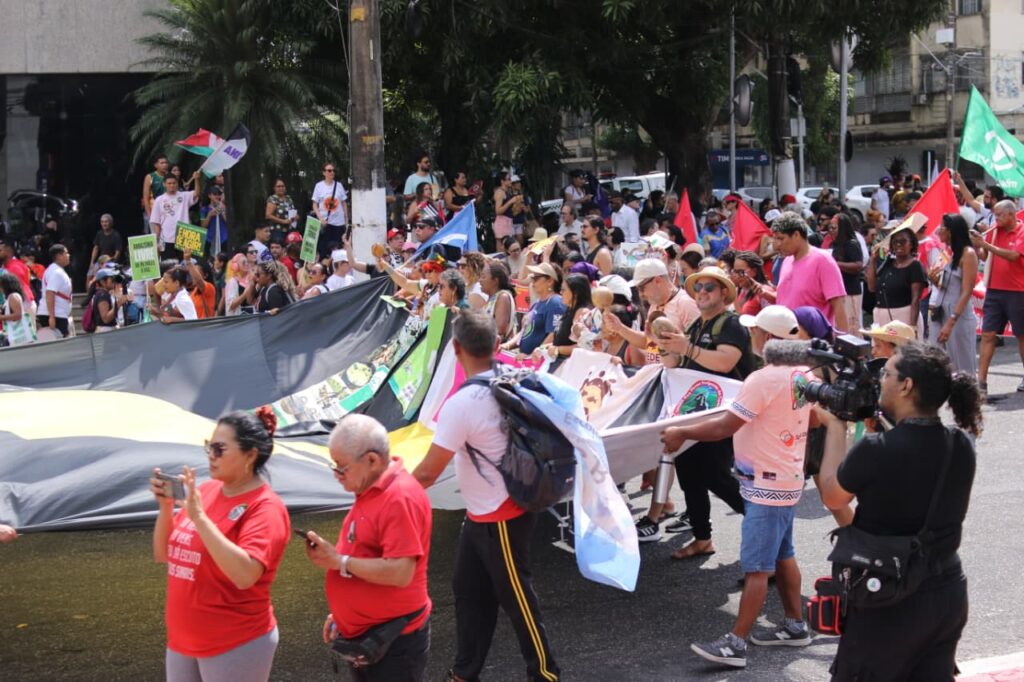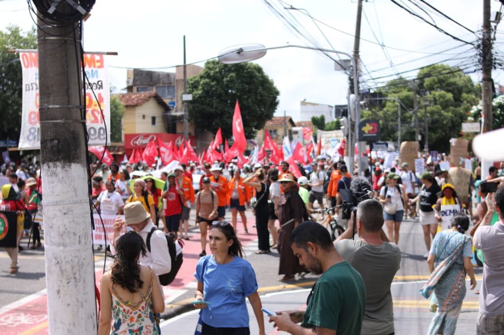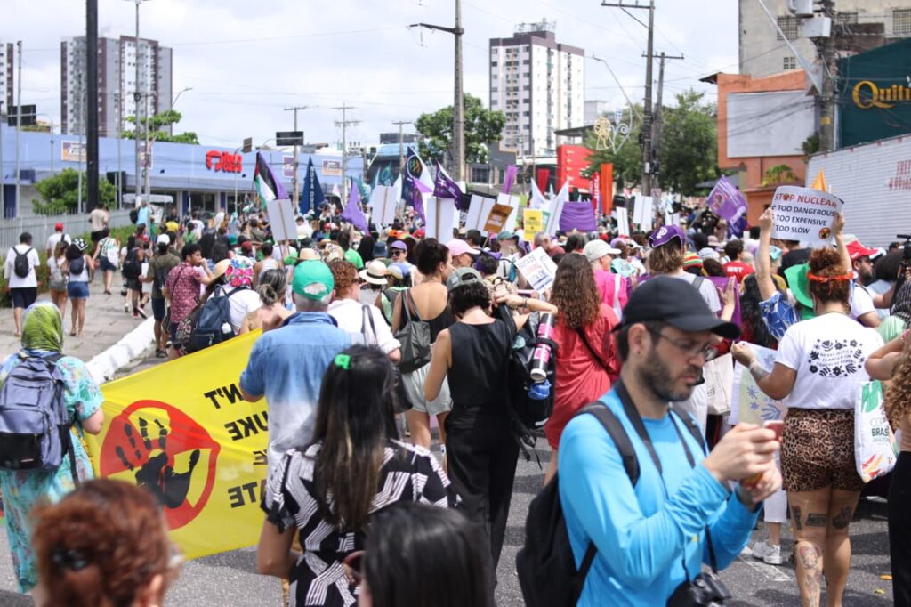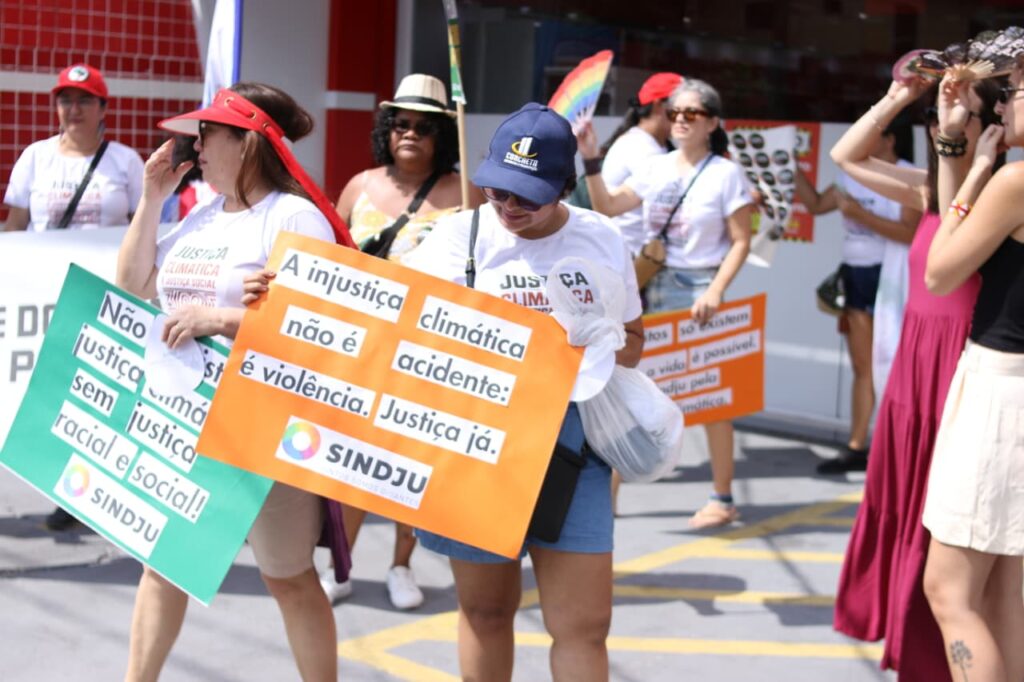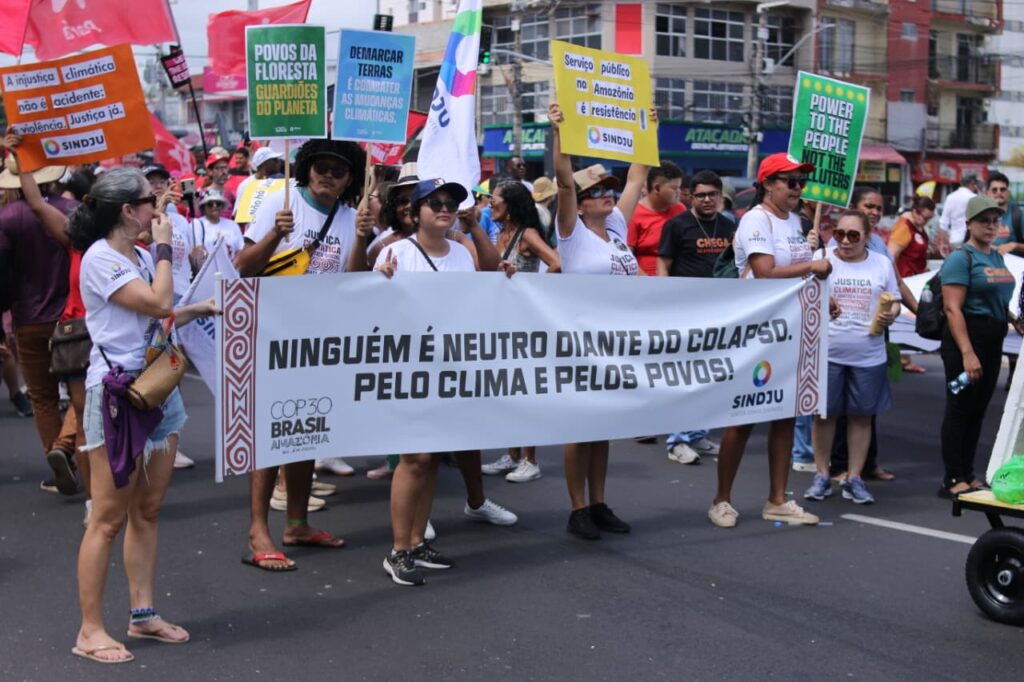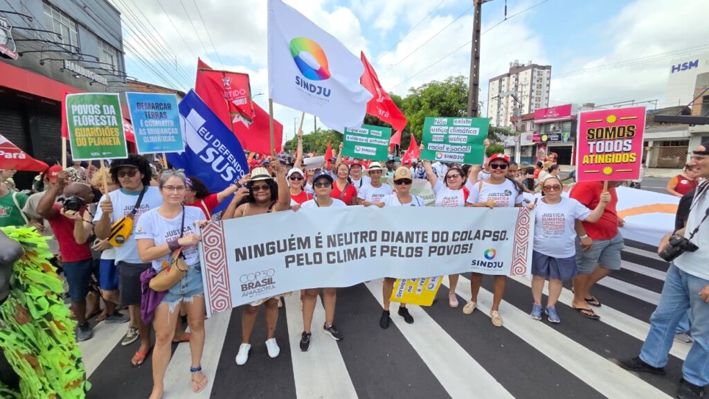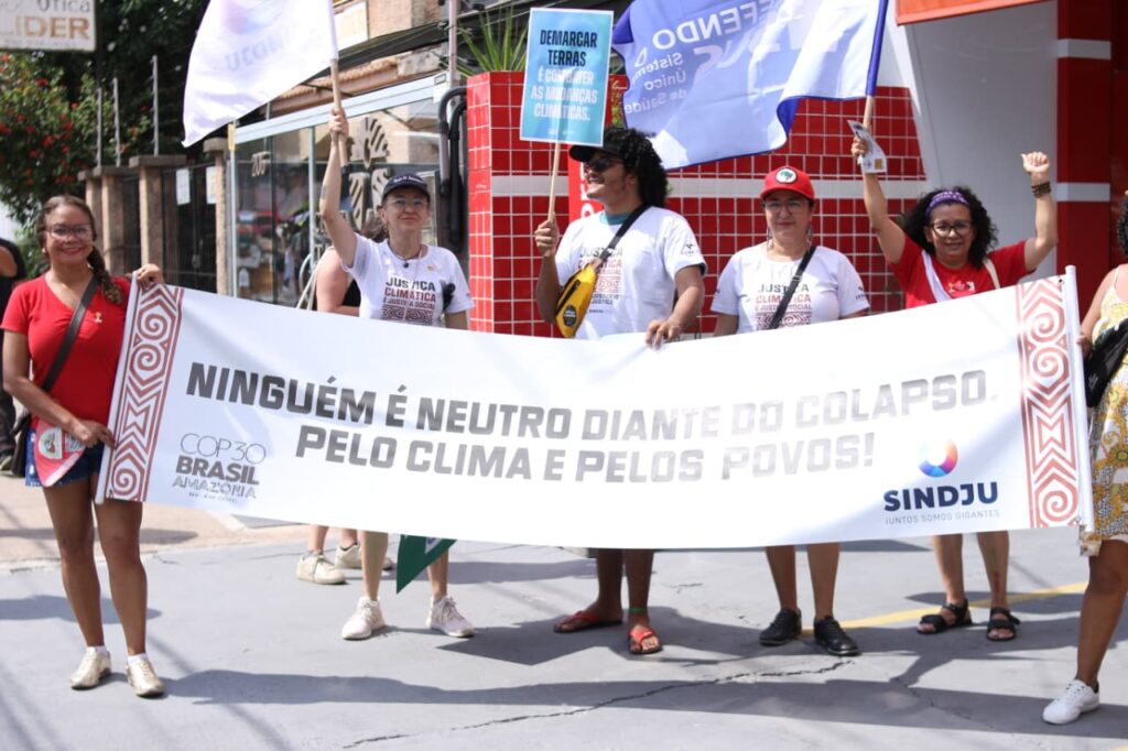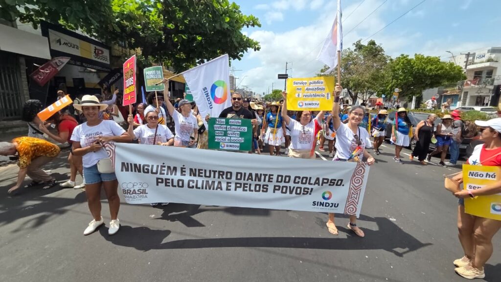 Além disso, o SINDJU se fez presente na Marcha Mundial pelo Clima, caminhando ao lado do Coletivo de Mulheres Eneidas e representantes da categoria. A mobilização em defesa do meio ambiente, da vida e do futuro reforçou a intersecção entre as agendas. A participação no ato, em pleno contexto da COP30, sinaliza que a luta climática é, inegavelmente, também uma luta sindical.